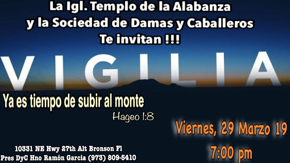 « All Events This event has passed. Vigilia Dept. Damas y Caballeros March 29, 2019 @ 7:00 pm - March 30, 2019 @ 12:00 am « Yard Sale DyC Ayuno Congregacional » Add to calendar Google Calendar iCalendar Outlook 365 Outlook Live Details Start: March 29, 2019 @ 7:00 pm End: March 30, 2019 @ 12:00 am Organizer Ramon García Phone 352-441-5951 Venue Igl. Templo de la Alabanza 10331 Ne Hwy 27th Alt. Bronson, FL 32621 + Google Map Phone 352-221-0367 View Venue Website